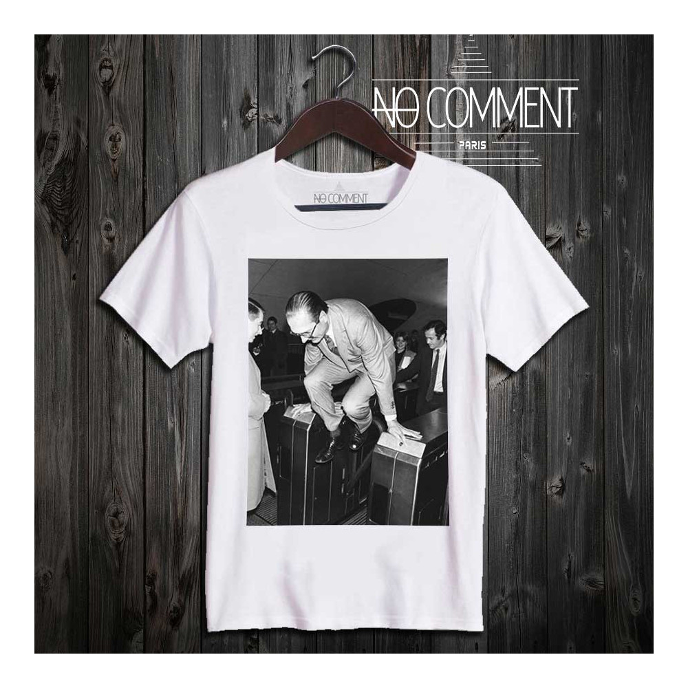 Hommage à l'ex président Jacques Chirac avec ce Tee-shirt à l'image surprenante de Monsieur Chirac entrain de sauter au dessus du tourniquet du métro ! pris en flagrant délit ! totalement délire à porter en toute légèreté !