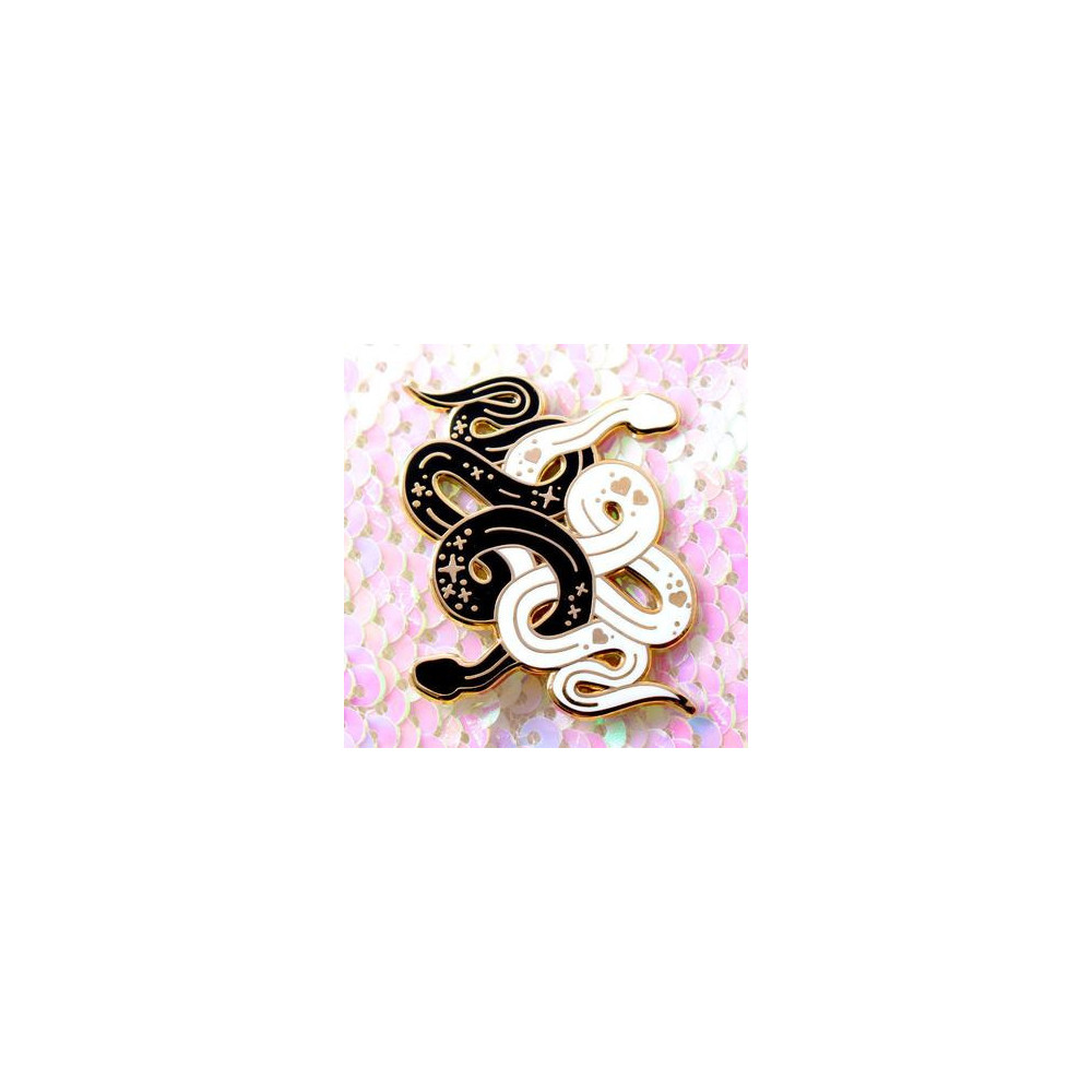 Si vous aimez les serpents, ce joli pin's en émail serpent noir et blanc entrelacée est fait pour vous ! Ce pin's de 40 mm représente un serpent noir avec des étoiles sur son corps et un serpent blanc avec des cœurs.