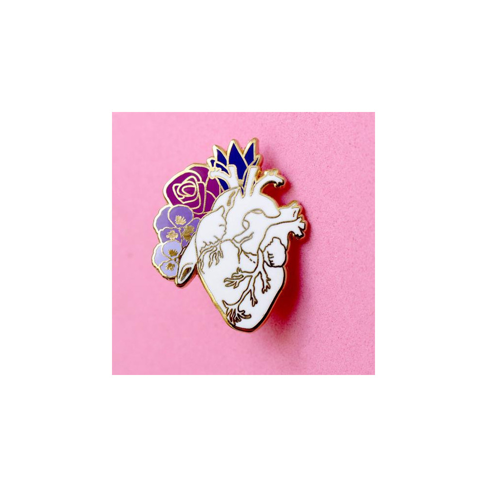 Qui a dit que la romance était morte ? Ce joli cœur anatomique entouré de fleurs est un pin's en émail parfait pour tous les vrais romantiques ! Ce pin's de 35 mm est disponible avec un cœur noir ou blanc, avec des fleurs violettes