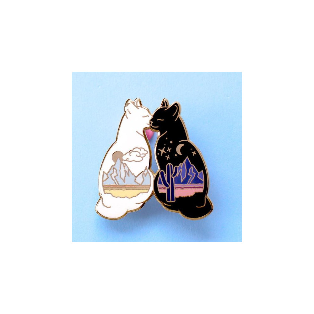 Là où le jour rencontre la nuit, ces deux adorables chats seront ! Ce pin's représente un chat noir et un chat blanc qui s'embrassent, avec des scènes de désert de jour et de nuit sur leur corps. Parfait pour ajouter un peu de mignon à votre sac, manteau ou tableau d'affichage !