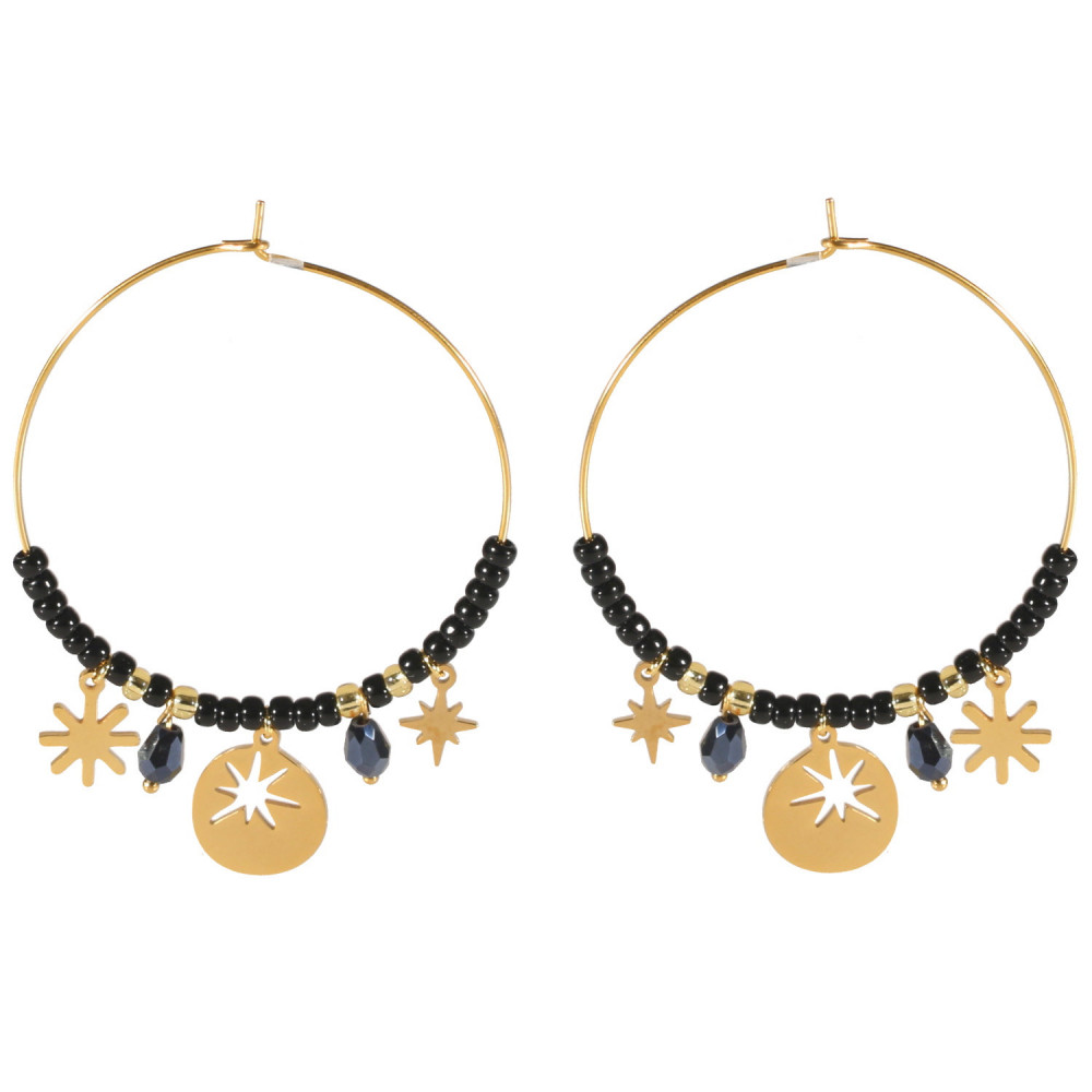 Boucles d'oreilles créoles avec pendants au motifs d'étoiles en acier doré et perles de couleur.