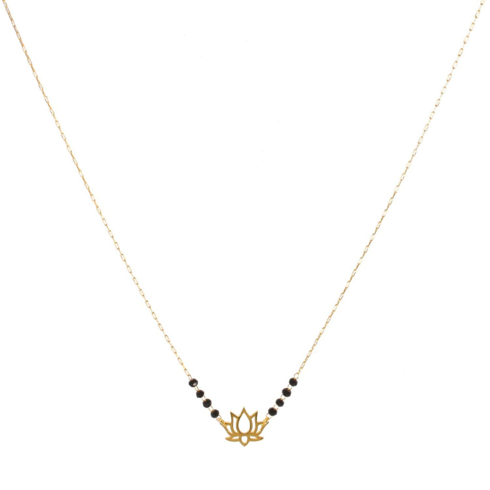 Ce collier est composé d'un pendentif fleur de lotus en acier doré et de perles de couleur noire.
