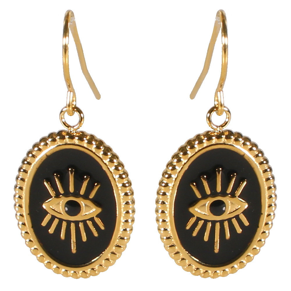 Ces magnifique boucles d'oreilles pendantes sont composées d'une pastille ovale avec œil de Turquie en acier doré.