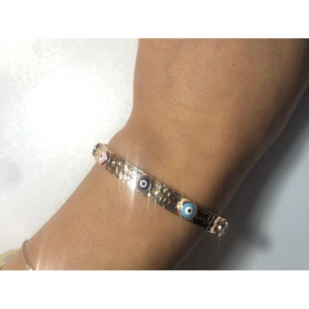 C'est un bracelet jonc combinant la partie breloque ovale mauvais œil avec la partie jonc ronde. La partie principale du charme ovale du mauvais œil est MOBILE, elle est donc facile à porter!